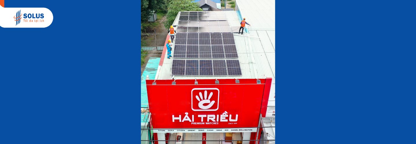 SOLUS vừa hoàn thiện và bàn giao hệ thống điện mặt trời hòa lưới 3 pha cho showroom đồng hồ Hải Triều tại đường Trường Chinh, phường Tân Bình, TP.HCM. Đây là một trong những dự án tiêu biểu ứng dụng giải pháp năng lượng tái tạo cho mô hình showroom – cửa hàng kinh doanh có nhu cầu sử dụng điện lớn vào ban ngày.