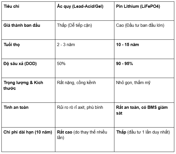 ? Kết luận: Chi phí mua ắc quy có thể rẻ bằng 1/3, nhưng trong 10 năm, bạn phải thay ắc quy ít nhất 4 lần. Tổng chi phí lúc này sẽ cao hơn gấp nhiều lần so với việc đầu tư một bộ Pin Lithium ngay từ đầu.
